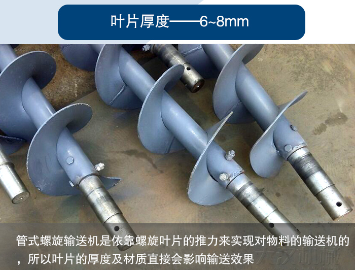 管式螺旋輸送機是依靠螺旋葉片的推力來實現對物料的輸送機的,所以葉片的厚度及材質直接會影響輸送效果,葉片厚度一般在6~8mm左右,也可以根據物料的耐磨程度來加厚,這些直接與設備的使用壽命掛鉤的,所以用戶在選型時要特別注意這一點。