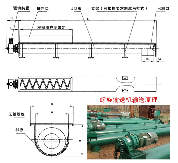 2、螺旋輸送機使用的環境溫度為—20~50℃ ;輸送機的傾角β≤20°;輸送長度一般小于40m,最長不超過70m。