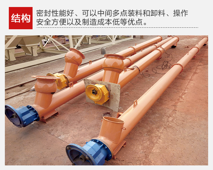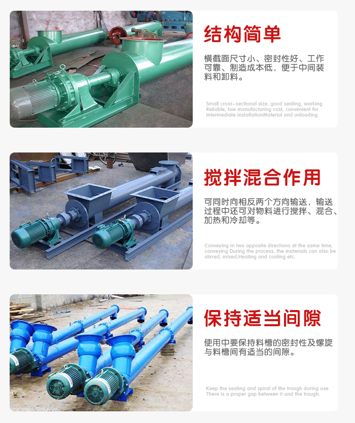 結構簡單、橫截面尺寸小、密封性好、工作可靠、制造成本低,便于中間裝料和卸料,輸送方向可逆向,也可同時向相反兩個方向輸送。輸送過程中還可對物料進行攪拌、混合、加熱和冷卻等作業。通過裝卸閘門可調節物料流量。但不宜輸送易變質的、粘性大的、易結塊的及大塊的物料。輸送過程中物料易破碎,螺旋及料槽易磨損。單位功率較大。使用中要保持料槽的密封性及螺旋與料槽間有適當的間隙。