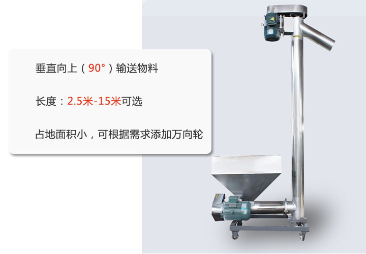 垂直螺旋輸送機用于解決需要垂直向上(90°)輸送物料的難題,其長度2.5米-15米,大家可根據(jù)需要選擇長度;相比普通螺旋輸送機,該款設(shè)計更好的節(jié)約了占地面積,也可根據(jù)場地需要添加移動輪,方便來回移動。