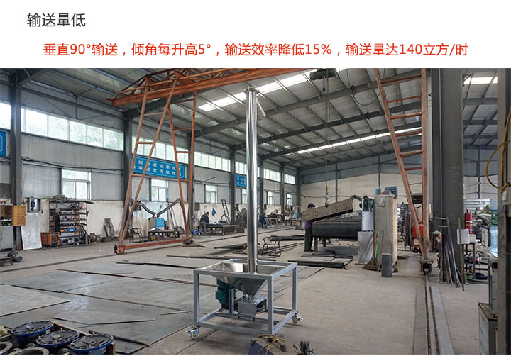 垂直螺旋輸送機采用垂直輸送的方式,其傾角為90°,在輸送中,輸送機的傾角每升高5°,輸送效率就會降低15%,因而造成輸送量較低,只能達(dá)140立方/時。