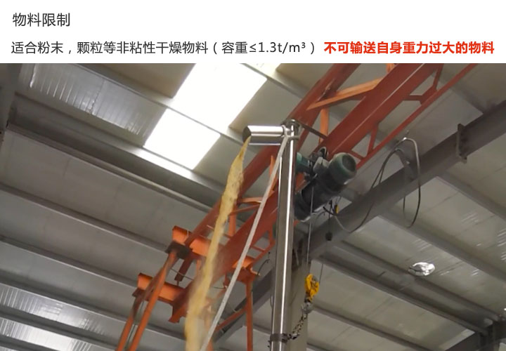 垂直螺旋輸送機只用于輸送粉末或固體顆粒等非粘性干燥物料(容重≤1.3t/m³),因為其采用向上輸送,在輸送過程中物料自身重力如果過重,會造成輸送難以進(jìn)行。