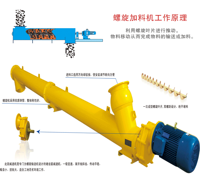 螺旋加料機主要的輸送角度為傾斜0°到45°之間大于45°就不能完成自由調(diào)整角度的功能,主要的輸送原理是利用螺旋葉片進(jìn)行推動,物料移動從而完成物料的輸送或加料。