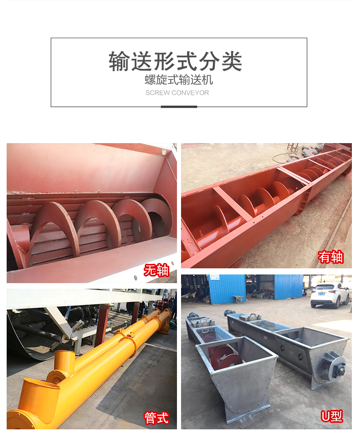 螺旋式輸送機在輸送形式上分為有軸螺旋式輸送機和無軸螺旋式輸送機兩種,在外型上分為U型螺旋式輸送機和管式螺旋式輸送機。
